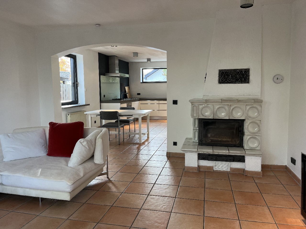 Wohn-/Essbereich offen gestaltet ist. Die Küche ist mit hochwertigen Einbauten des Herstellers Paxmann ausgestattet. Im Wohnbereich sorgt ein gekachelter Kamin im modernen Landhausstil für Behaglichkeit. Durch das bodentiefe Fenster-/Türenelement im Wohnbereich gelangt man auf die mit Bankiraiholz belegte Terrasse und in den pflege-leicht angelegten Garten. Über die offene massive Eichenholztreppe betritt man das erste Obergeschoss mit zwei Schlafzimmern. Das straßenseits gelegene Schlafzimmer beherbergt ein ensuite tagesbelichtetes Wannenbad.