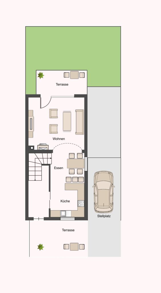 Das ca. 218 m² große Grundstück bietet vor dem Haus einen schönen Freisitz und einen daneben liegenden PKW-Stellplatz. Der rückwärtige pflegeleicht angelegte Garten ist mit Sträuchern, Hecken, Bäumen und einer Rasenfläche bepflanzt. Neben dem Haus befindet sich ein Carport mit Toreinfahrt.