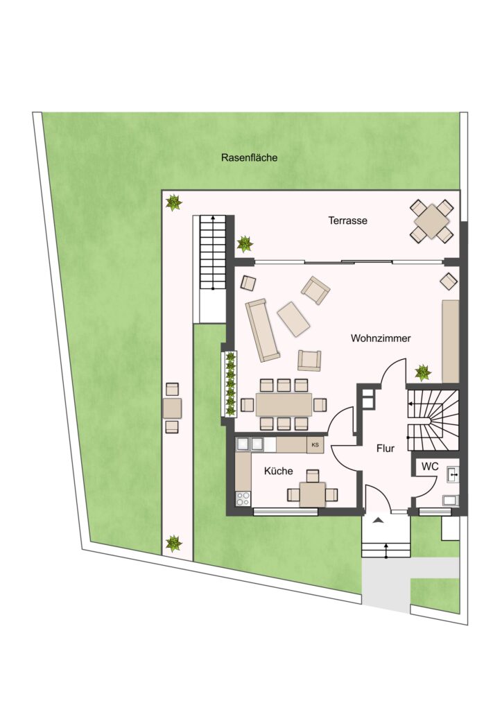 Das ca. 362 m² große süd-west ausgerichtete Grundstück liegt in einer ruhigen Anliegerstraße. Das Haus verfügt über einen kleinen Vorgarten und einen pflegeleicht angelegten Garten mit einer Rasenfläche, Sträuchern und Bäumen.