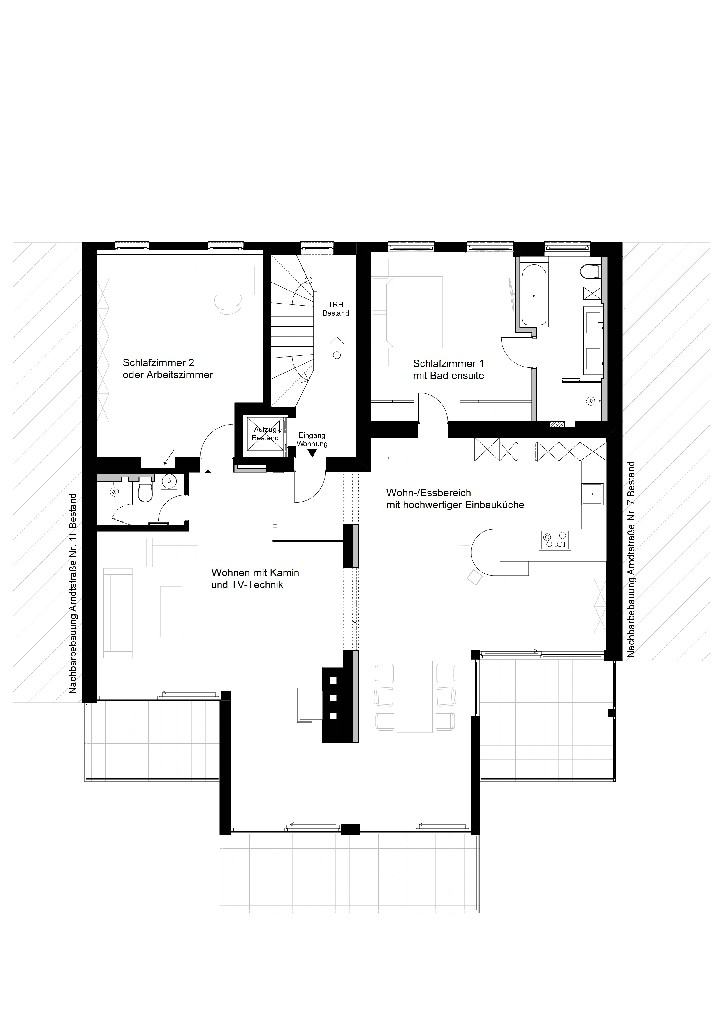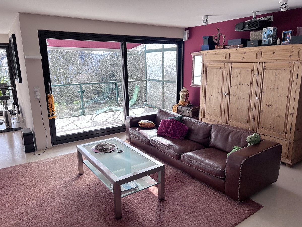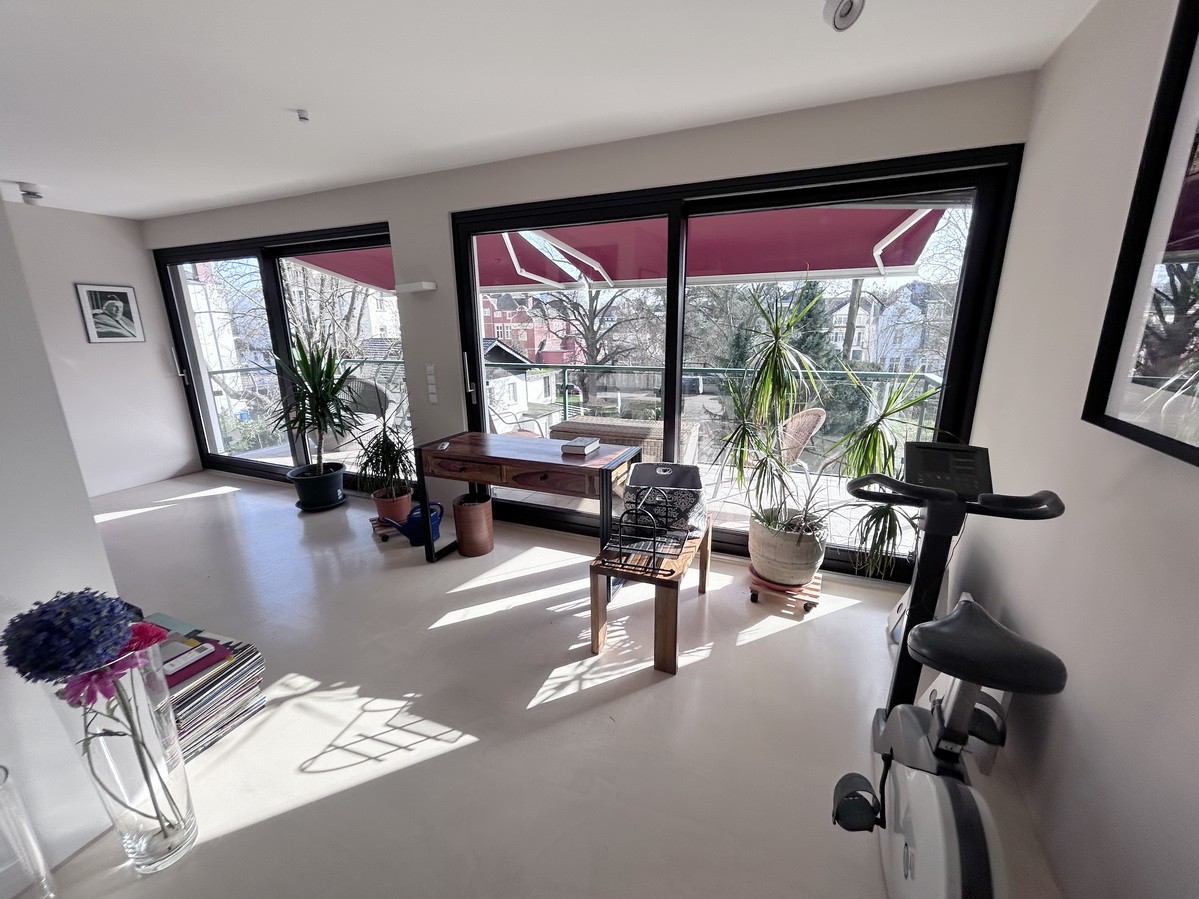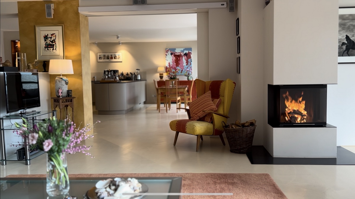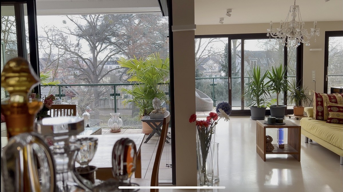 Von der Eingangstür gelangt man unmittelbar in den großzügigen und offen gestalteten Wohnbereich (107 m²), der sich über gesamte Hausbreite erstreckt und sich in Wohnen mit Kamin sowie Küche und Essen gliedert. Ebenfalls in Hausbreite verläuft die bodentiefe Fensterfront in Südostausrichtung. Schiebtüranlagen erschließen drei Balkone mit Blick ins Grüne. Da hier der hauseigene und die Gärten der Nachbarschaft aneinander stoßen, ergibt sich ein schöner Panoramablick.