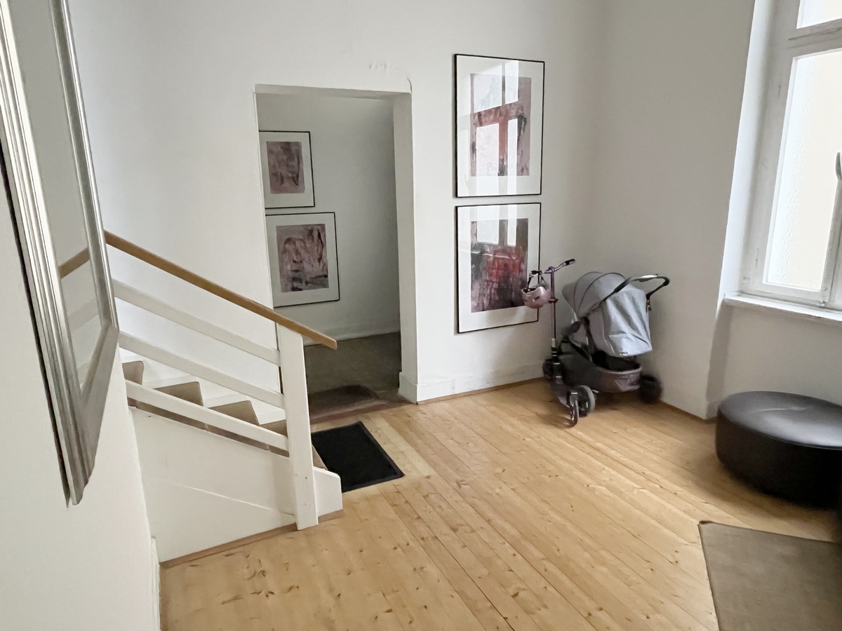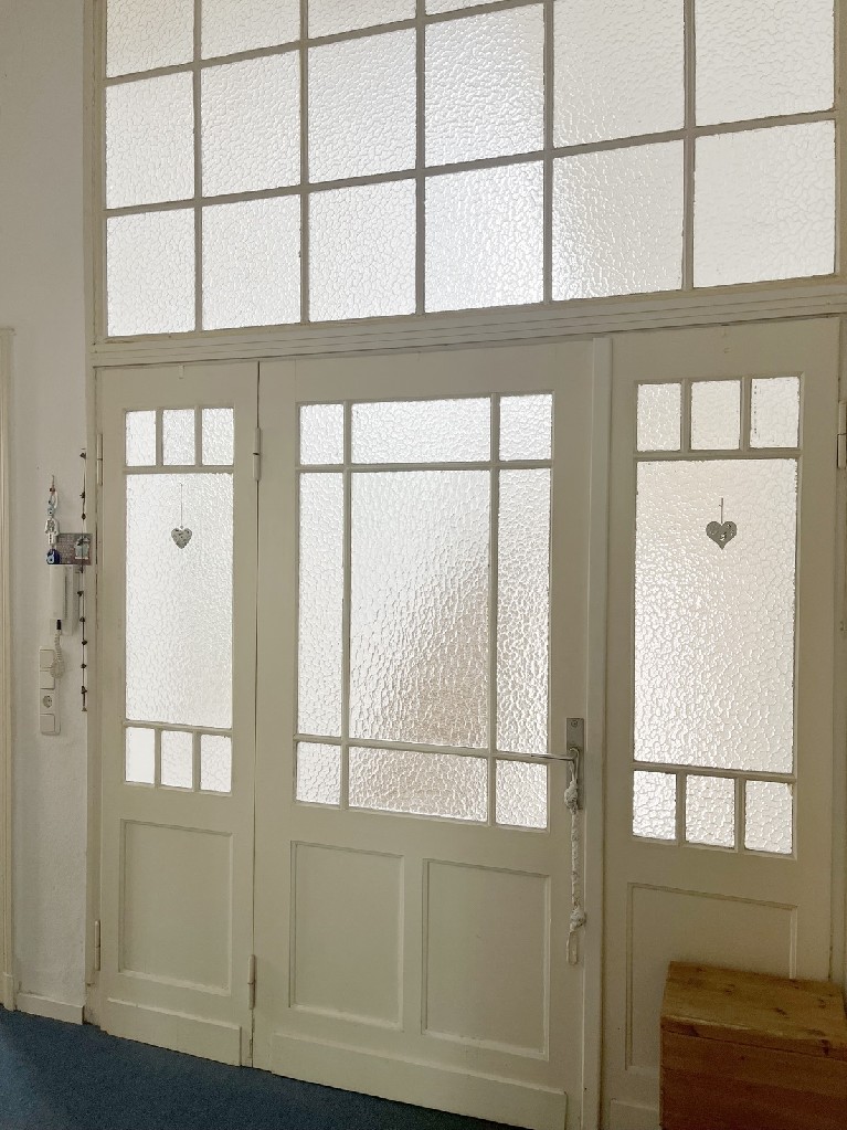 Die gründerzeitlichen Merkmale im Inneren des Gebäudes (hohe Decken, Kassettentüren) sind erhalten, leider ist kein Deckenstuck mehr vorhanden. Die Böden der Erdgeschosswohnung ist mit Stäbchenparkett belegt, die Wohnung im 2. Obergeschoss hat aufgearbeitete Fichtendielen, im 1. Obergeschoss wurde Teppichboden verlegt (wir gehen davon aus, dass darunter noch historischer Dielenboden zu finden ist).