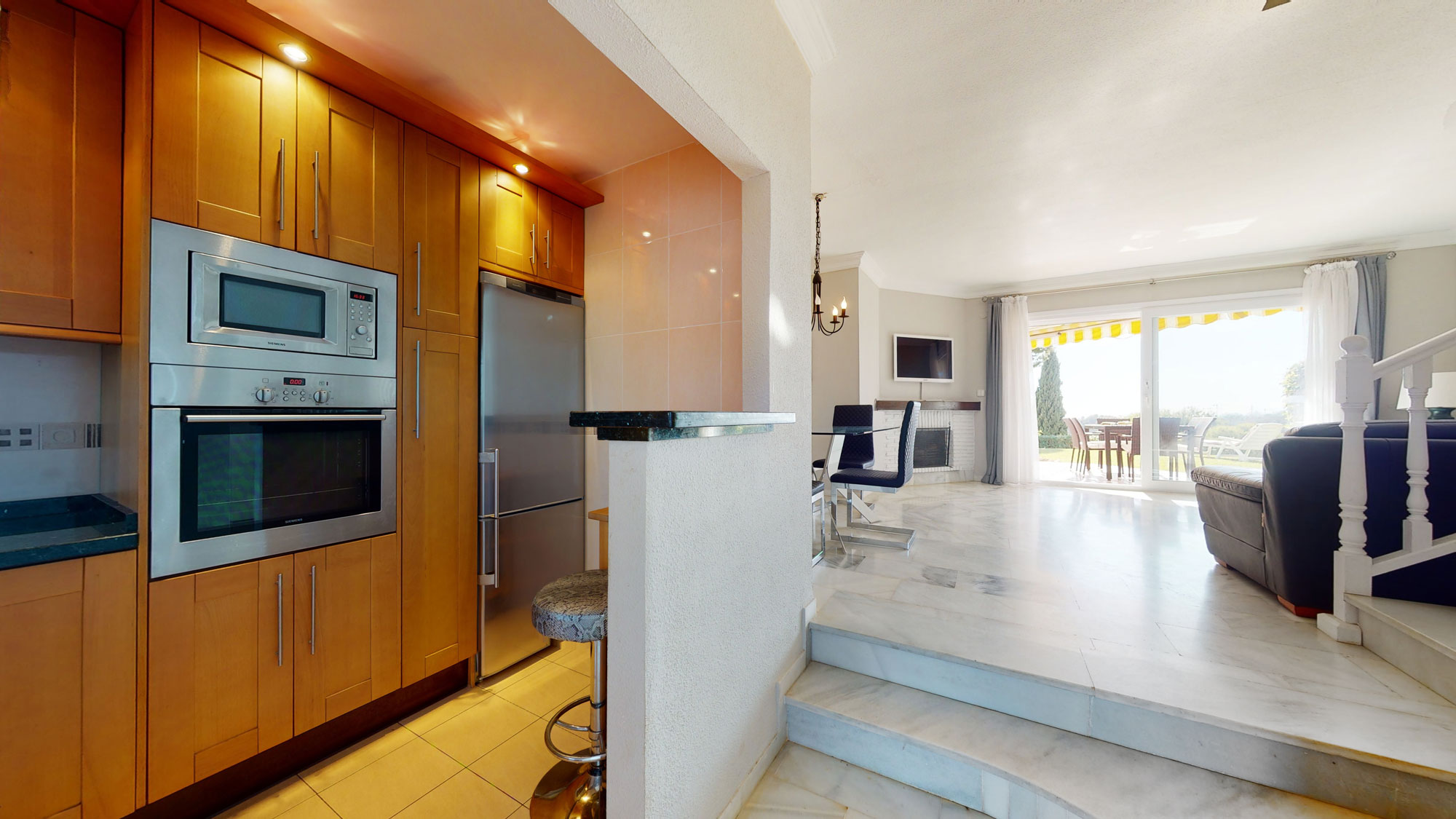 Über zwei Stufen gelangt man in den Wohnbereich mit offenem Kamin. An der linken Raumseite ist der Essbereich integriert. Durch eine Terrassentüranlage betritt man die große geflieste Terrasse und den Gemeinschaftsgarten.