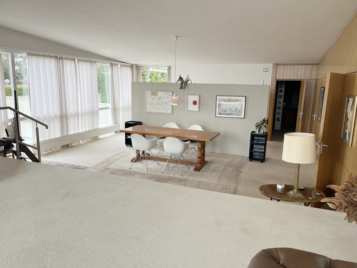 Über eine offene Treppe (Stahlkonstruktion mit Natursteinstufen) erreicht man die großzügigen Räume in der oberen Wohnebene. Der an zwei Seiten mit bodentiefen Fenstern gestaltete großzügige Wohn-/Essbereich bietet einen grandiosen Blick ins Rheintal. In dem, um drei Stufen höhergelegenen, Wohnbereich ist ein offener Kamin eingebaut.