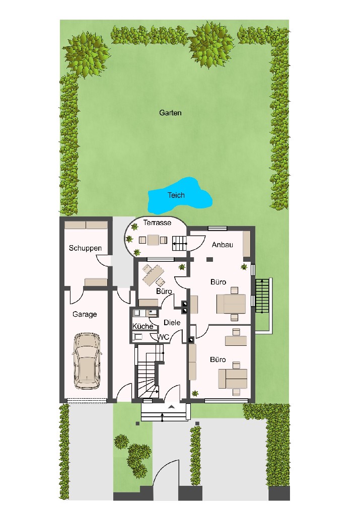 Das ca. 787 m² große Grundstück ist gartenseitig mit Rasen, Bäumen und Büschen und einem kleinen Teich angelegt. Neben dem gepflegten Vorgarten liegt die Garage mit dahinterliegendem Raum für Gartengeräte, weitere Möglichkeiten zum Abstellen von Fahrzeugen sind gegeben.