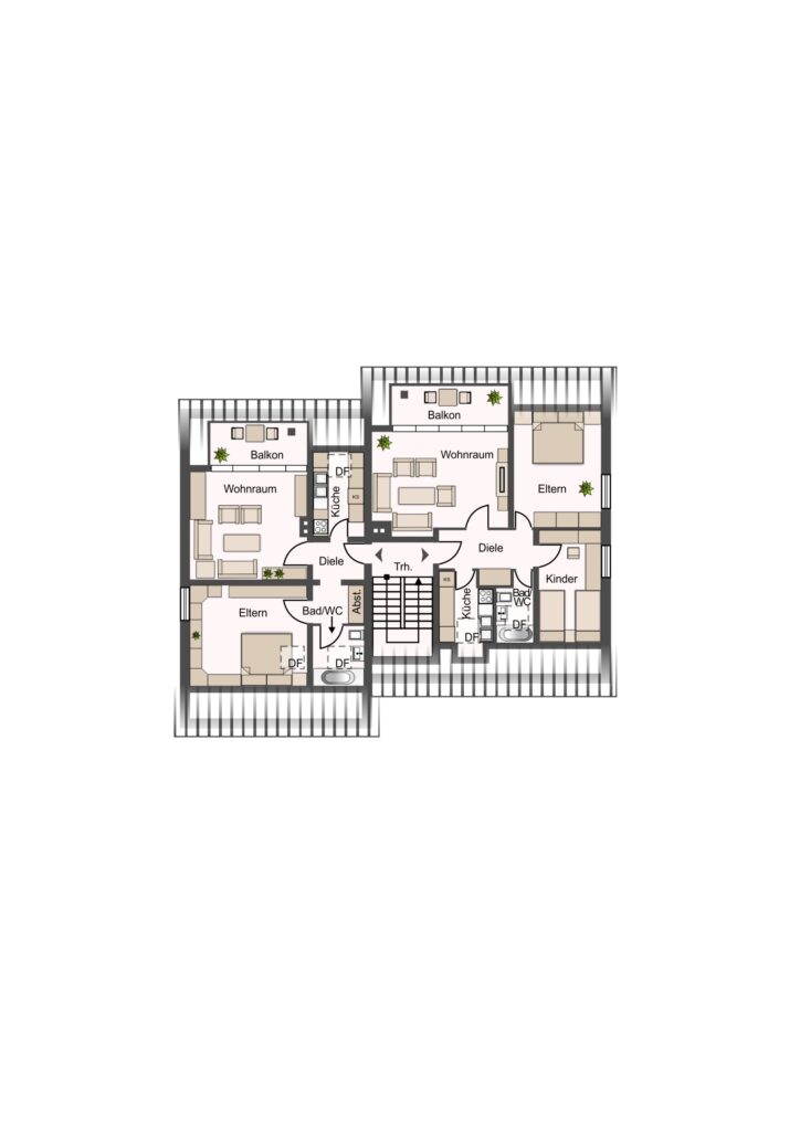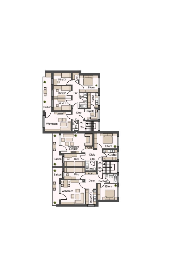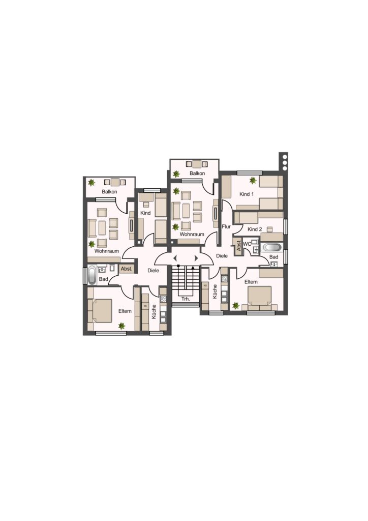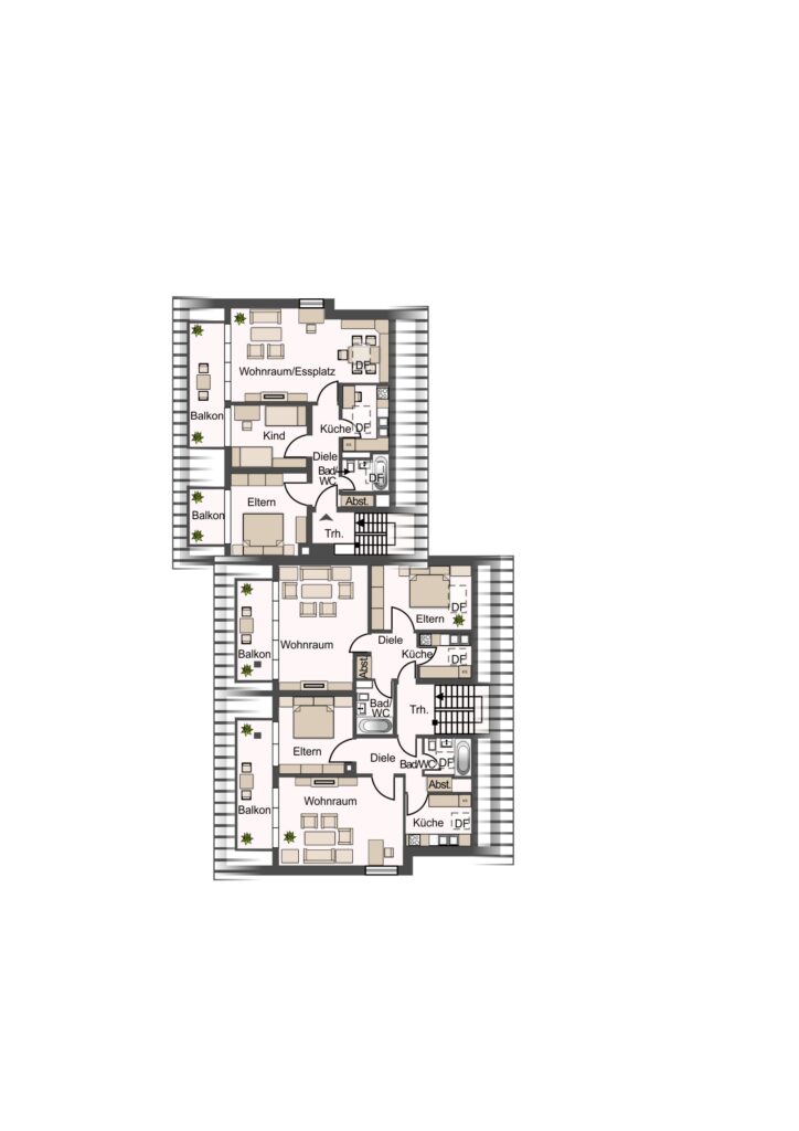 Das 2 1/2-geschossige 6-Parteienhaus teilt sich im Erd-/ und Obergeschoss je in eine 3-Zimmer- und in eine 4-Zimmerwohnung auf. Im Dachgeschoss liegt eine großzügige 2-Zimmer- und eine 3-Zimmerwohnung. Jede Wohneinheit verfügt über einen Balkon bzw. eine Terrasse im Erdgeschoss. Die Wohnung im Dachgeschoss links wurde in 2022 gänzlich saniert (Bad, Elektro, Fenster, Böden), die nebenliegende Einheit erhielt ebenso dreifachverglaste Fenster. Die Bäder der beiden Wohnungen im 1. Obergeschoss wurden in den 2000er Jahren modernisiert und sind zeitgemäß. Eine der beiden Einheiten erhielt in 2018 eine neue Elektro-Unterverteilung. Die Wohnung im Erdgeschoss links wurde in 2018 saniert (Bad, Elektro, etc.). Lediglich die Wohnung im Erdgeschoss rechts bedürfte bei einem Mieterwechsel einer Modernisierung. Die Böden der Einheiten sind überwiegend mit Parkett und Vinyl belegt, teils mit PVC. Im Untergeschoss stehen den Mietern -neben den wohnungseigenen Abstellräumen- ein Wasch– und Trockenraum, ein Fahrradraum und ein Kinderwagenraum zur gemeinschaftlichen Nutzung zur Verfügung. Ebenso befindet sich hier der Heizungsraum mit nebenliegendem Tankraum.