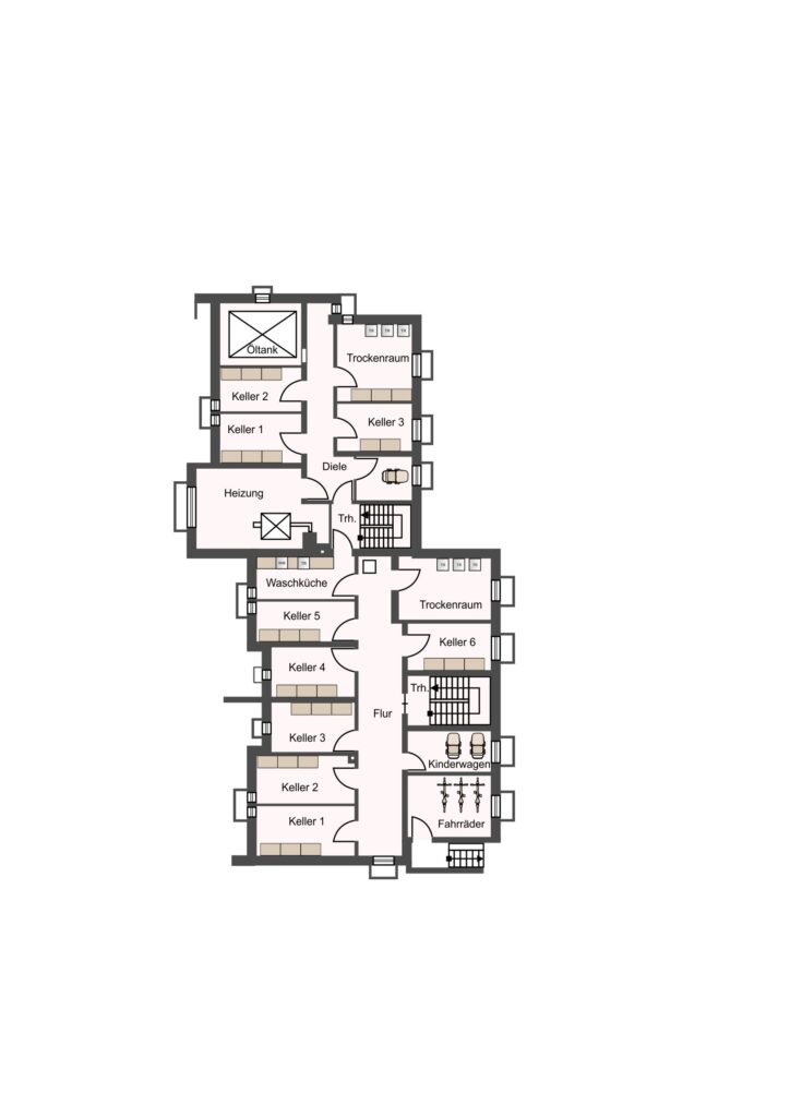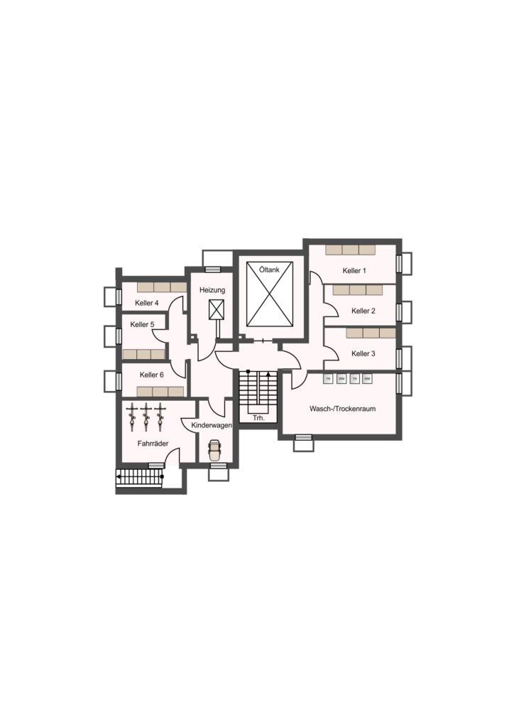 Im Untergeschoss der Liegenschaft stehen auch hier den Mietern -neben den wohnungseigenen Abstellräumen- Wasch– und Trockenräume, ein Fahrrad- und Kinderwagenraum zur gemeinschaftlichen Nutzung zur Verfügung. Ebenso befindet sich hier der Heizungsraum sowie der Tankraum.
