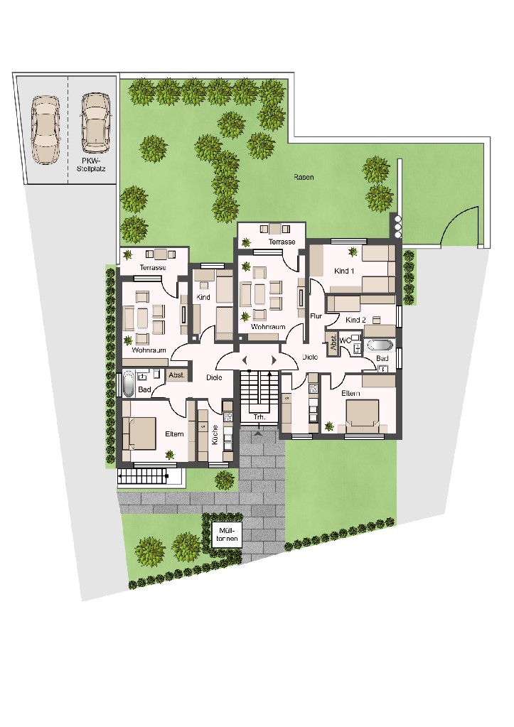 Das ca. 2.066 m² große Areal liegt zwischen den beiden ruhigen Anliegerstraßen. Die Zuwegungen zu den Häusern erfolgt über die jeweilige Straße. Zwischen den Gebäuden gibt es, gesäumt von gepflegten Hecken, kleineren Bäumen und Rasenflächen, einen gepflasterten Innenhof mit Autostellplätzen. Außerdem wurde dort ein Fahrradcarport als überdachte Stahlkonstruktion und Lochblechen errichtet, in dem auch die Mülltonnen ihren Platz haben.